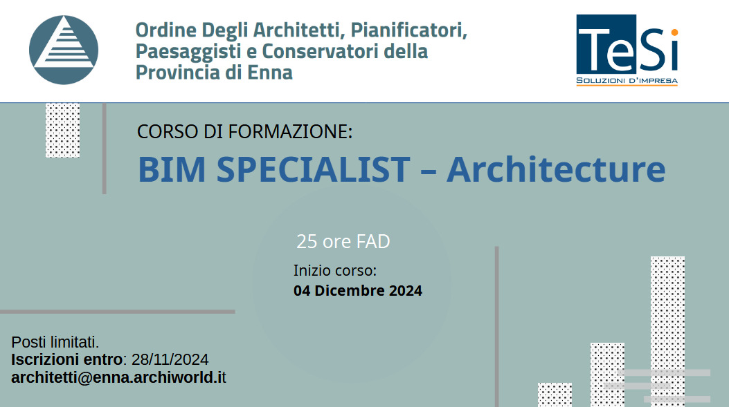 L'Ordine degli Architetti, Pianificatori, Paesaggisti e Conservatori della Provincia di Enna in collaborazione con TeSi S.r.l. organizza un corso di specializzazione BIM SPECIALIST ARCHITETTURA (con Software ArchiCAD) della durata di 25 ore in modalità FAD